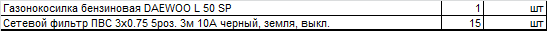| Газонокосилка бензиновая DAEWOO L 50 SP 1 шт Сетевой фильтр ПВС 3х0.75 5роз. 3м 10А черный, земля, выкл. 15 шт | Услуги по розничной торговле, кроме розничной торговли автотранспортными средствами и мотоциклами | Штука | 1 | 1 | 55500,00 | Упрощенная система налогообложения (без НДС) |